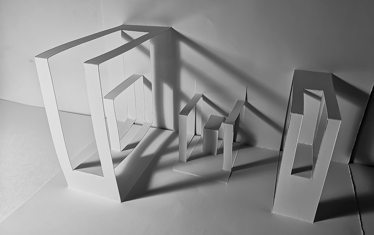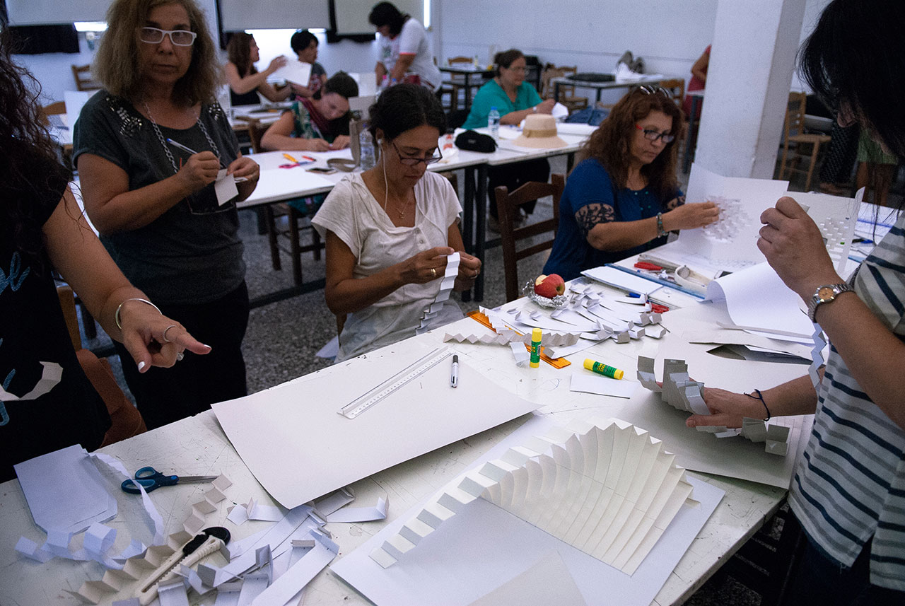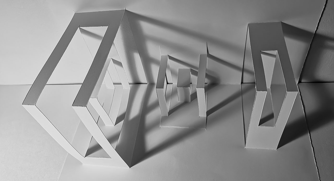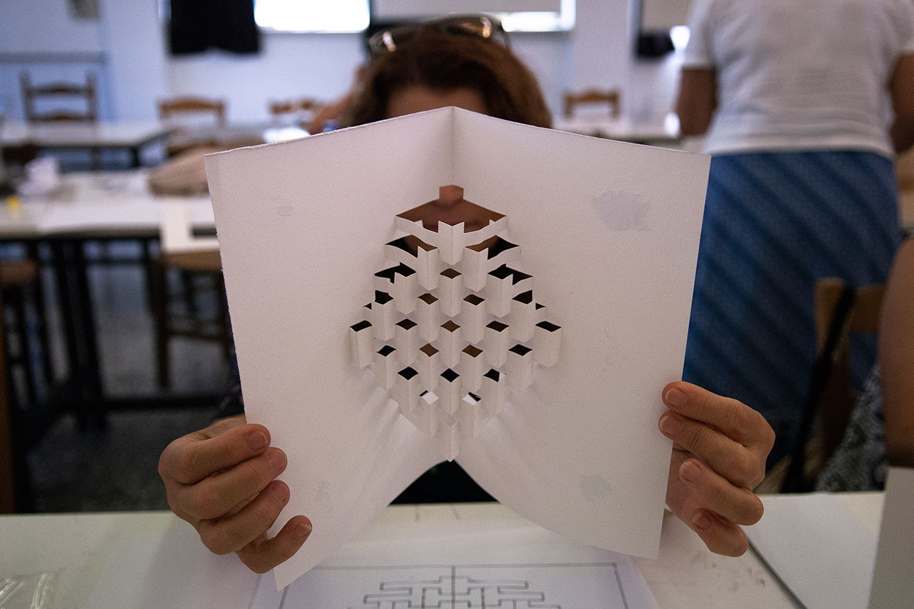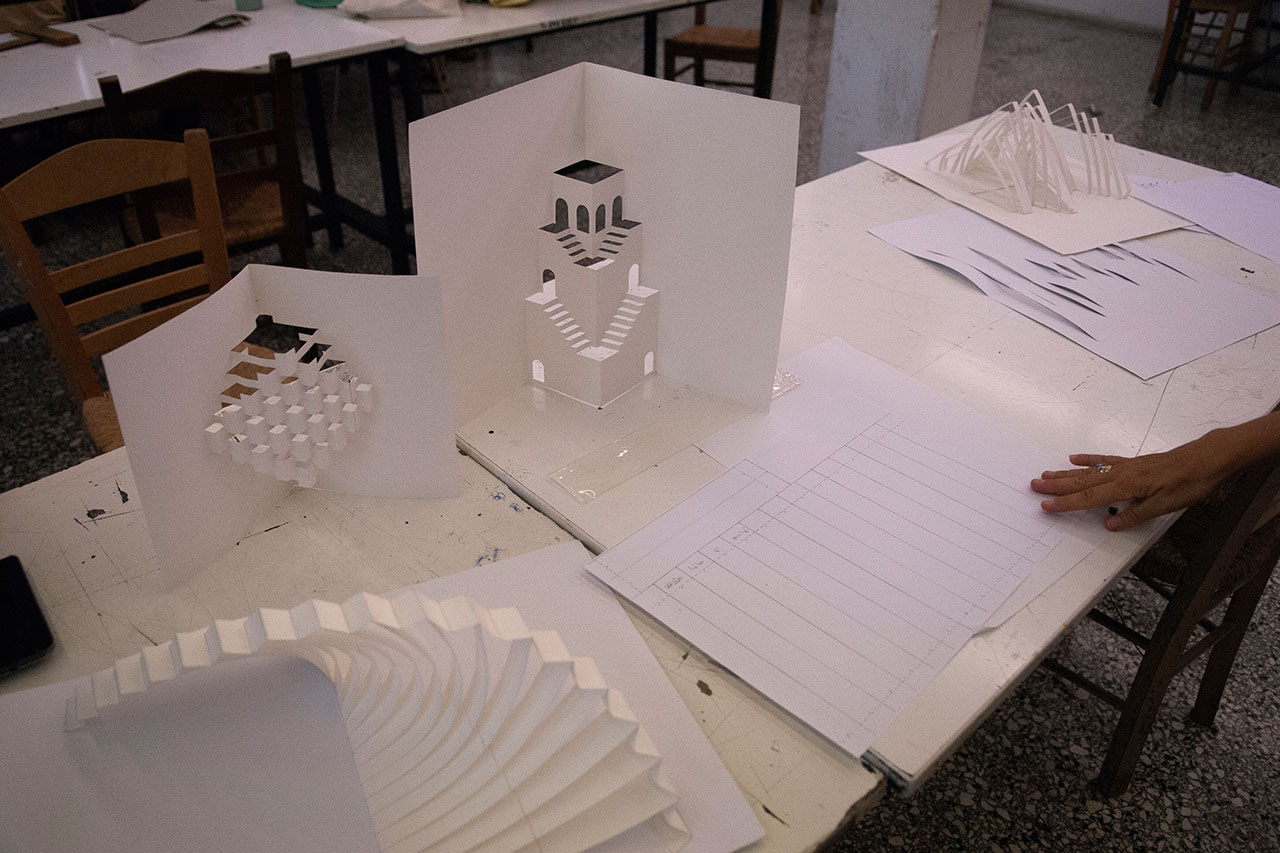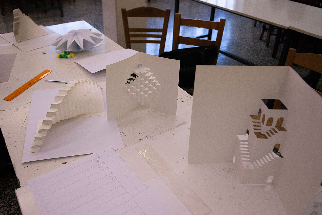 Παρουσίαση εικαστικού εργαστηρίου με δημιουργία τρισδιάστατων κατασκευών σε λευκό χαρτόνι. Αναπτύγματα γεωμετρικών σχηματισμών, με την τεχνική της χαρτοκοπτικής, διαμορφώνουν στον χώρο των τριών διαστάσεων, ευφάνταστες γεωμετρικές δομές. Με την χρήση του φωτός, αναδεικνύουμε την αρχιτεκτονική δομή της σύνθεσης, σκηνογραφώντας με την σκιά τους.