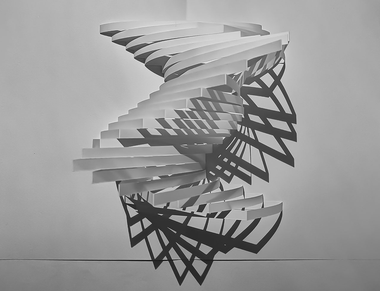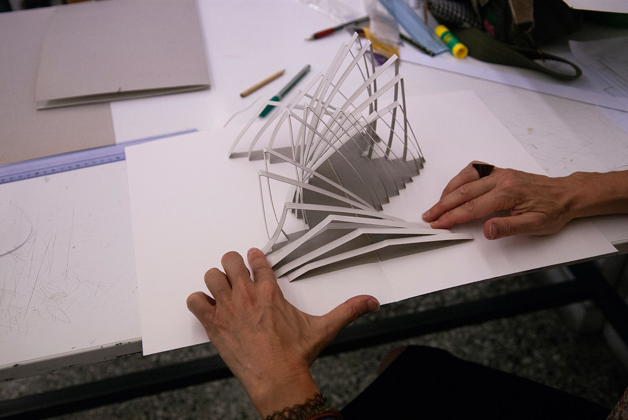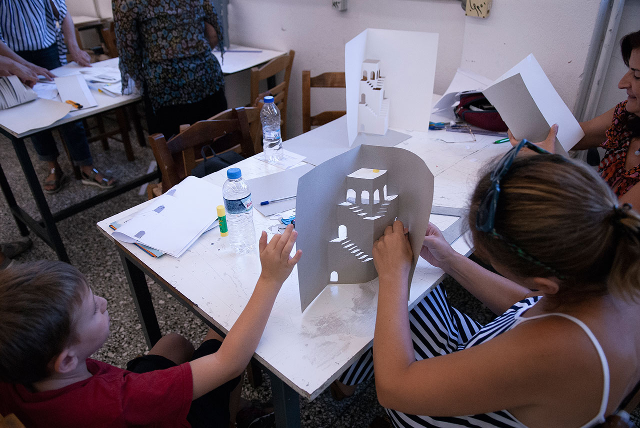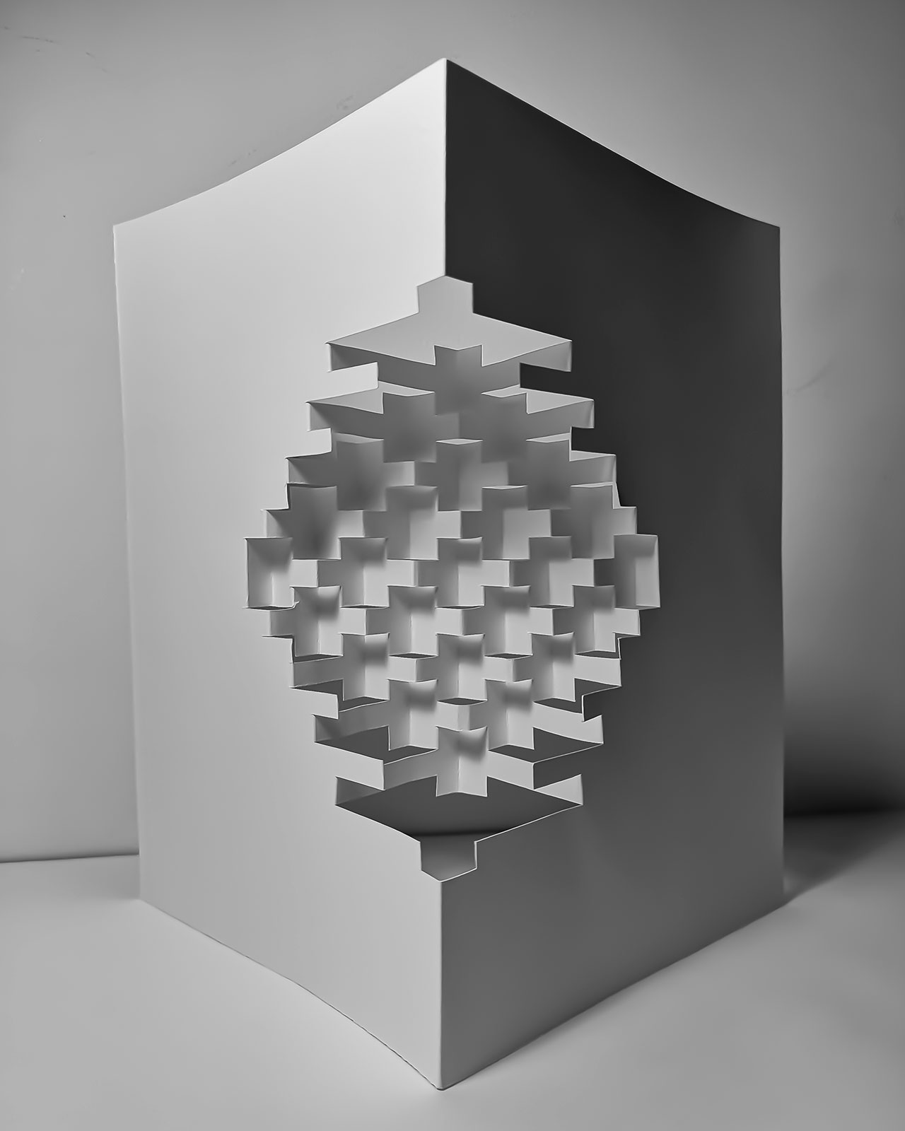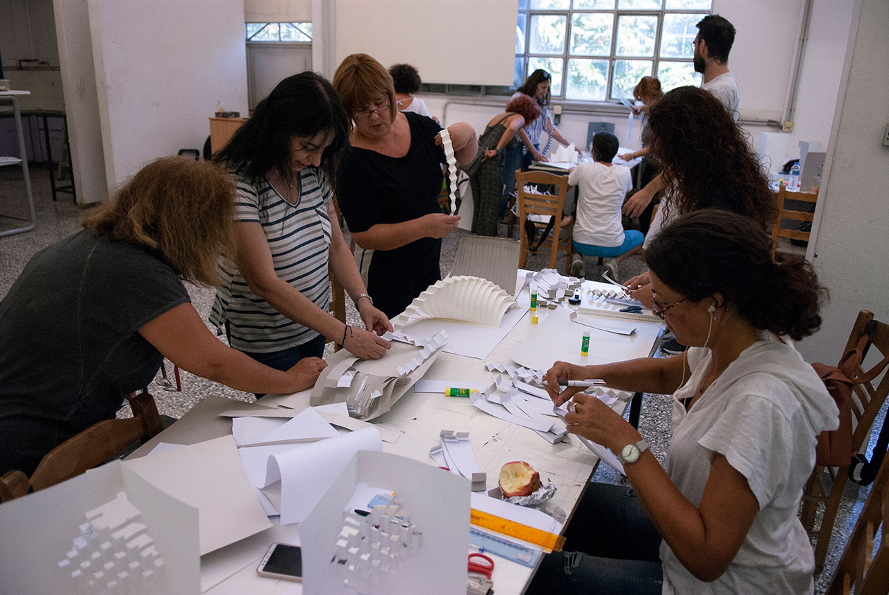 Παρουσίαση εικαστικού εργαστηρίου με δημιουργία τρισδιάστατων κατασκευών σε λευκό χαρτόνι. Αναπτύγματα γεωμετρικών σχηματισμών, με την τεχνική της χαρτοκοπτικής, διαμορφώνουν στον χώρο των τριών διαστάσεων, ευφάνταστες γεωμετρικές δομές. Με την χρήση του φωτός, αναδεικνύουμε την αρχιτεκτονική δομή της σύνθεσης, σκηνογραφώντας με την σκιά τους.