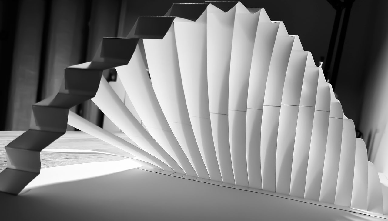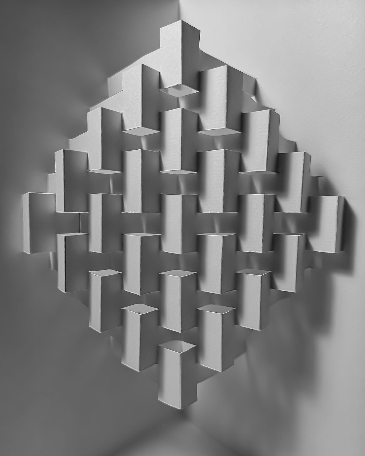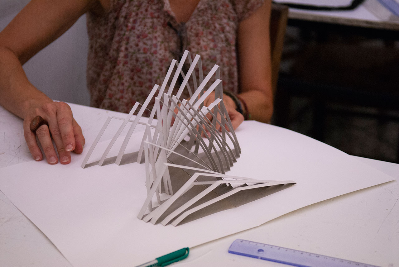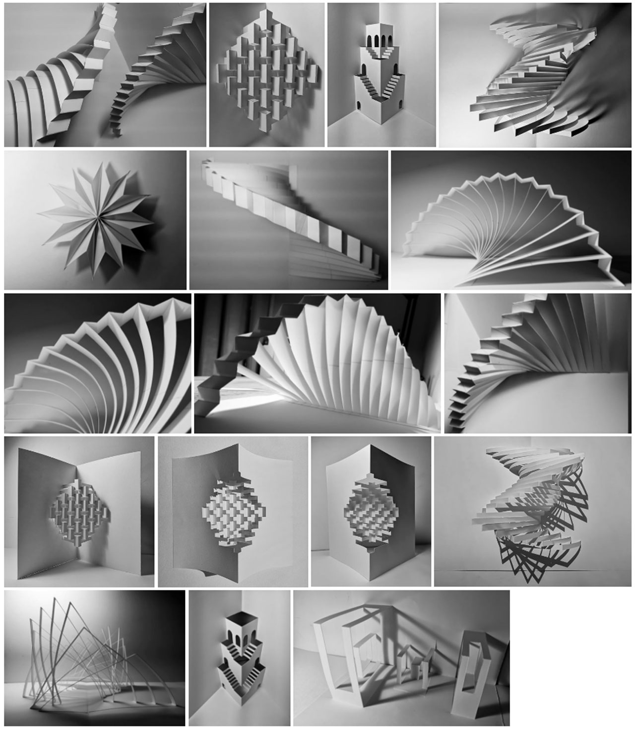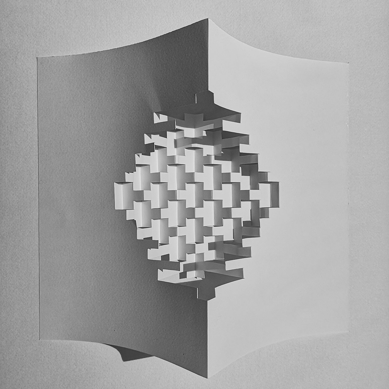 Παρουσίαση εικαστικού εργαστηρίου με δημιουργία τρισδιάστατων κατασκευών σε λευκό χαρτόνι. Αναπτύγματα γεωμετρικών σχηματισμών, με την τεχνική της χαρτοκοπτικής, διαμορφώνουν στον χώρο των τριών διαστάσεων, ευφάνταστες γεωμετρικές δομές. Με την χρήση του φωτός, αναδεικνύουμε την αρχιτεκτονική δομή της σύνθεσης, σκηνογραφώντας με την σκιά τους.