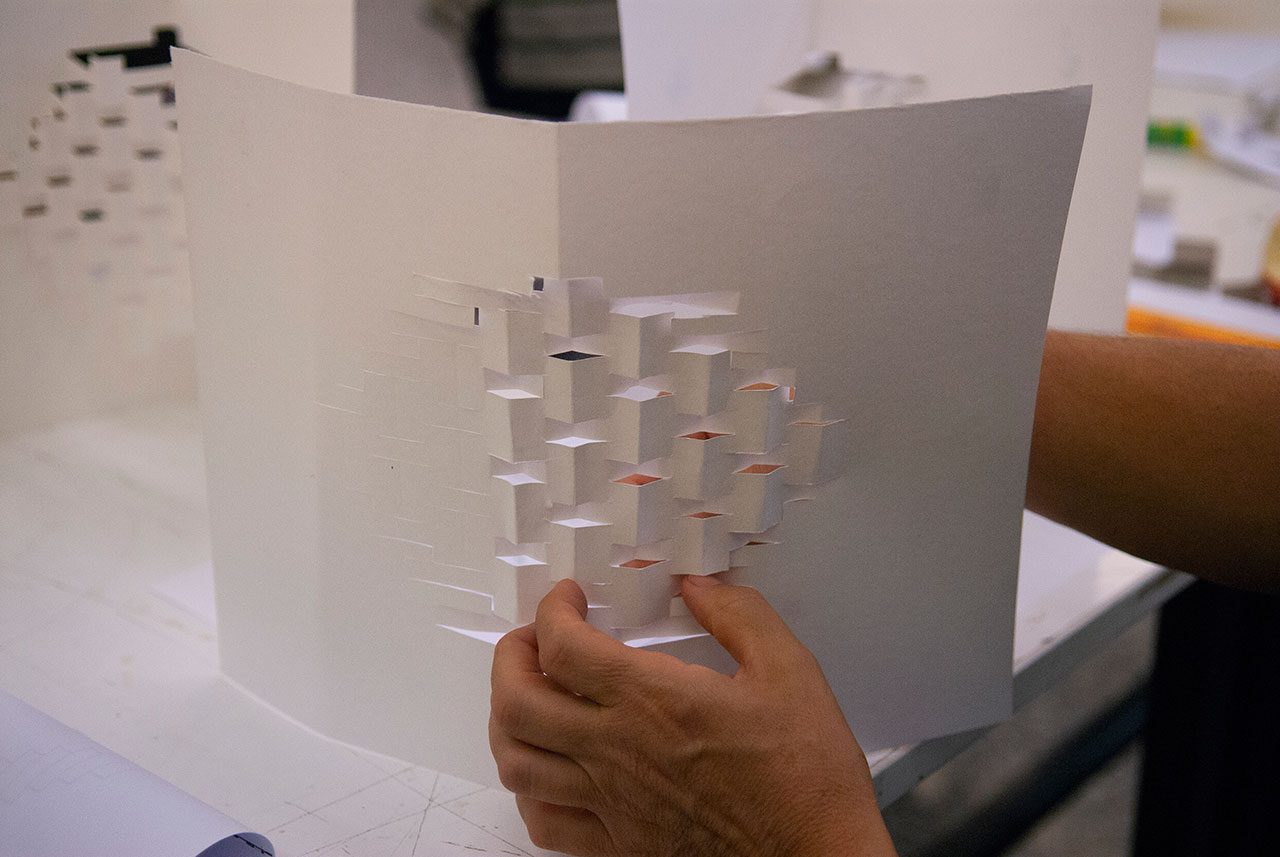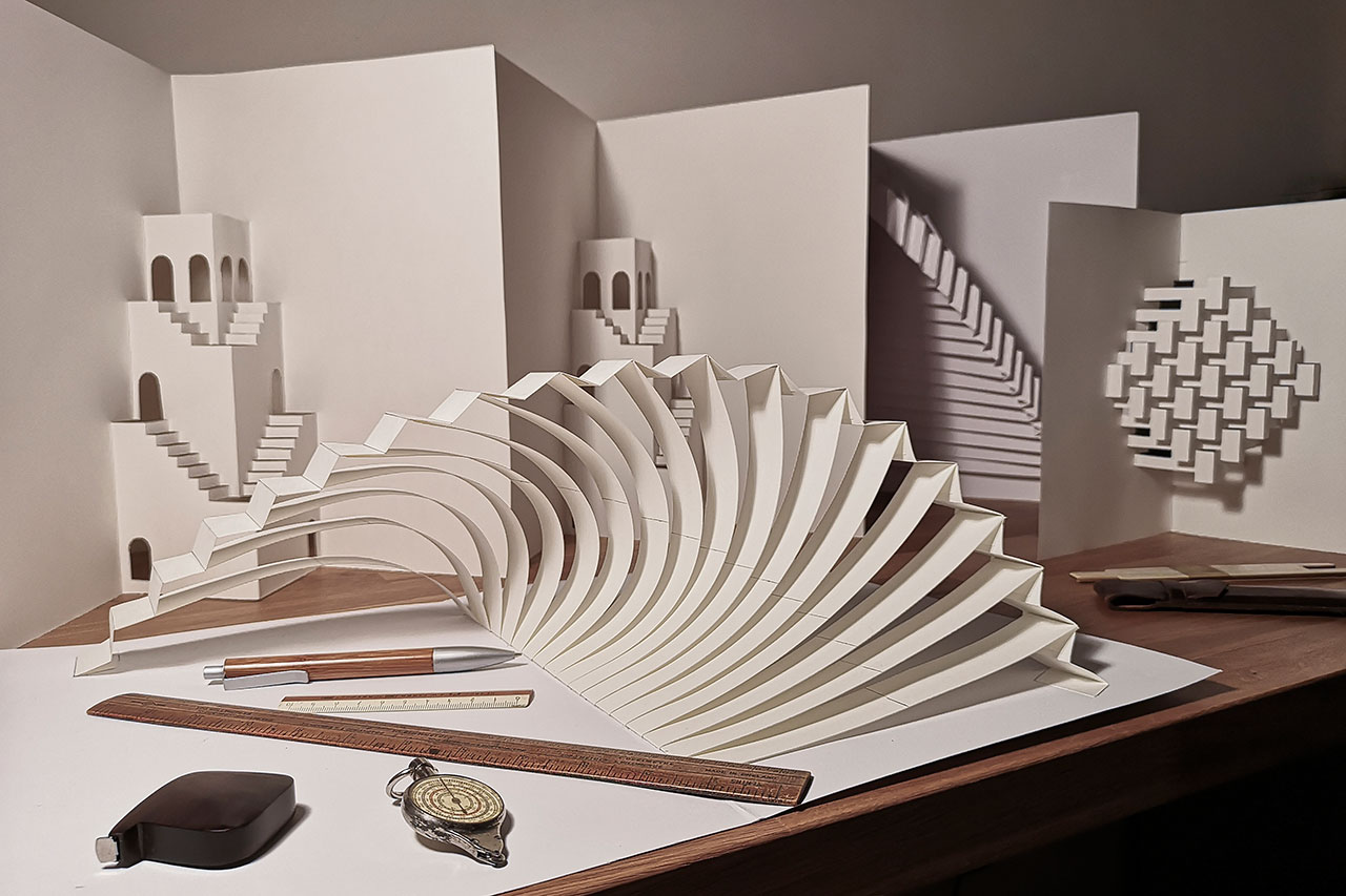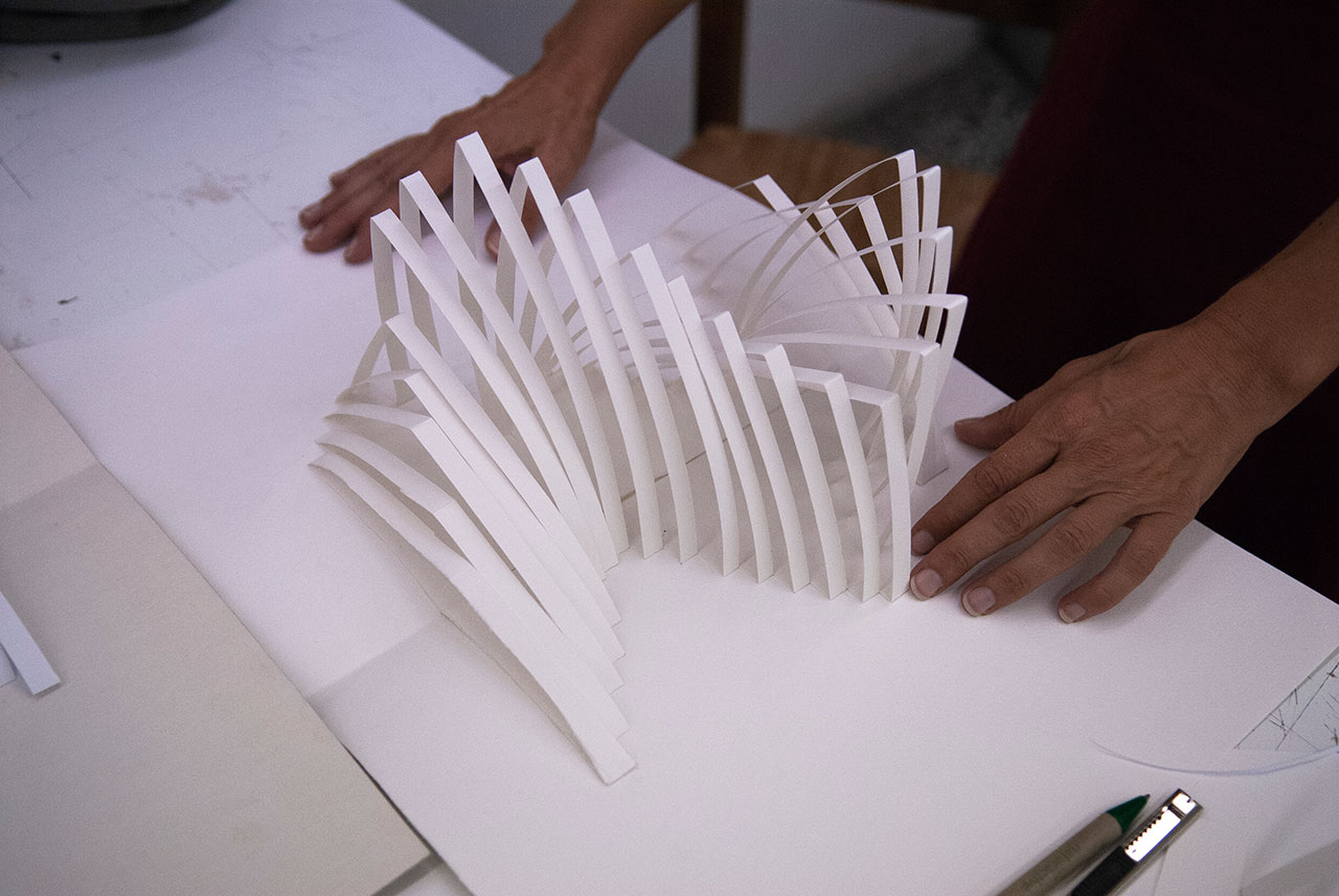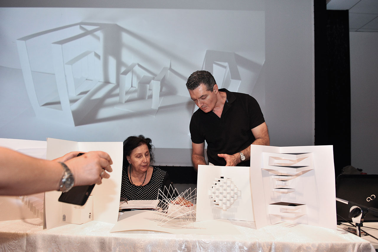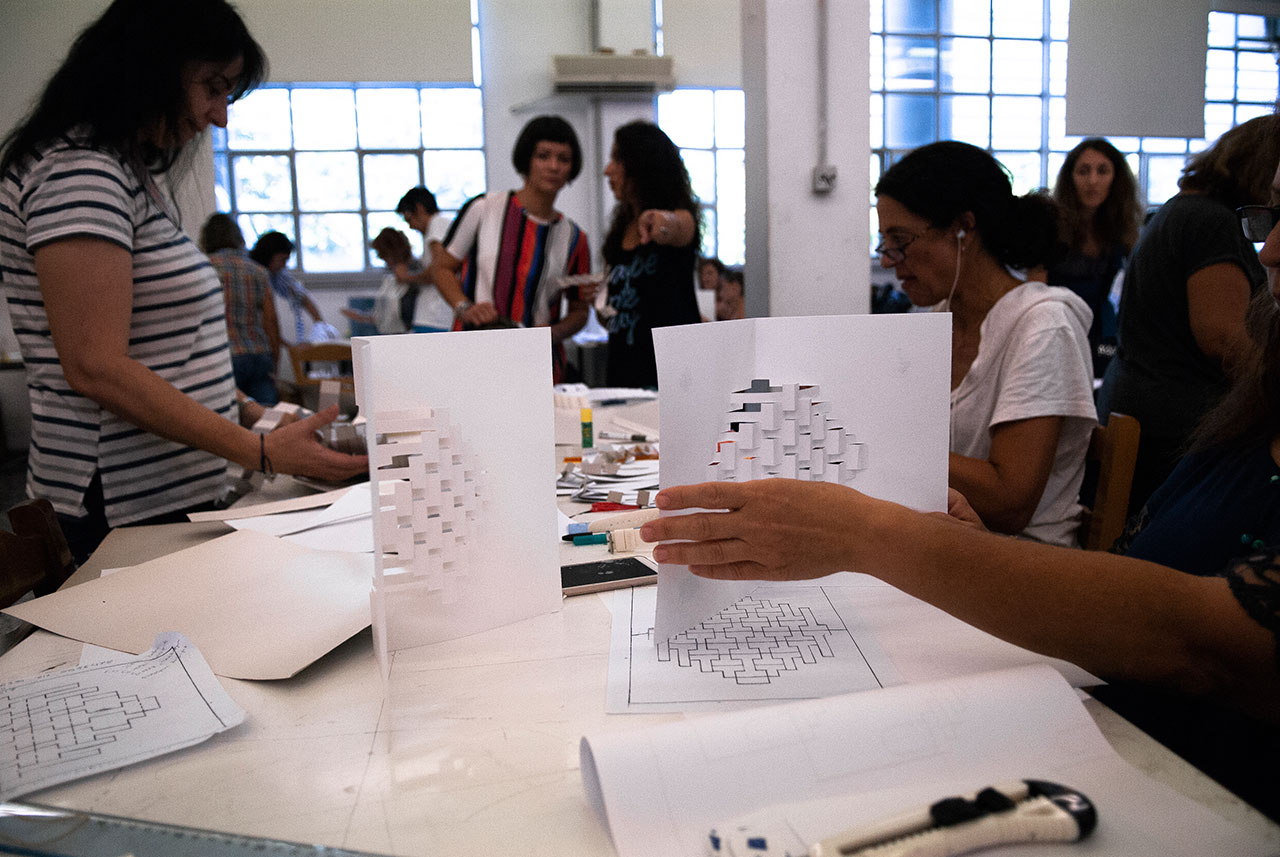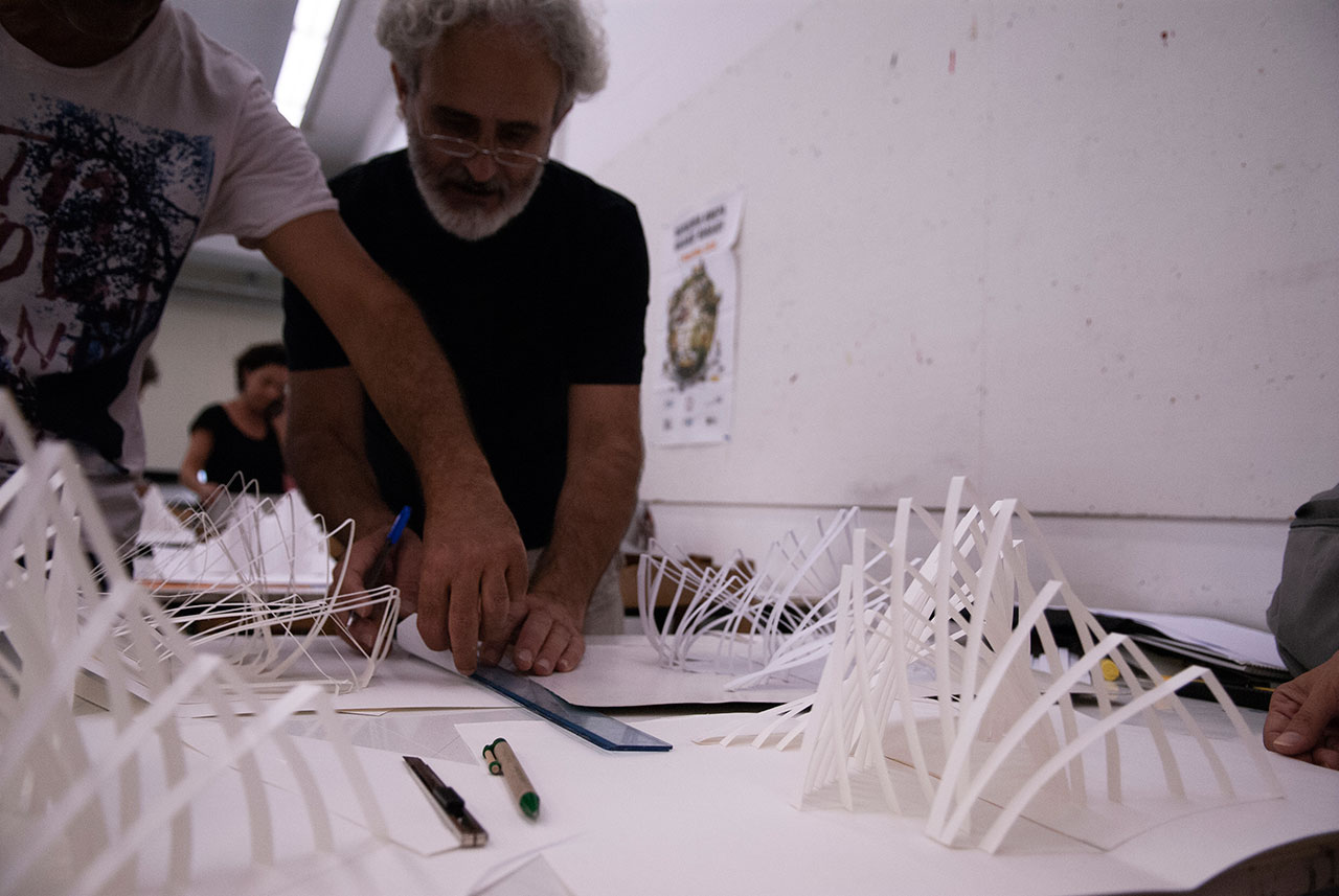 Παρουσίαση εικαστικού εργαστηρίου με δημιουργία τρισδιάστατων κατασκευών σε λευκό χαρτόνι. Αναπτύγματα γεωμετρικών σχηματισμών, με την τεχνική της χαρτοκοπτικής, διαμορφώνουν στον χώρο των τριών διαστάσεων, ευφάνταστες γεωμετρικές δομές. Με την χρήση του φωτός, αναδεικνύουμε την αρχιτεκτονική δομή της σύνθεσης, σκηνογραφώντας με την σκιά τους.