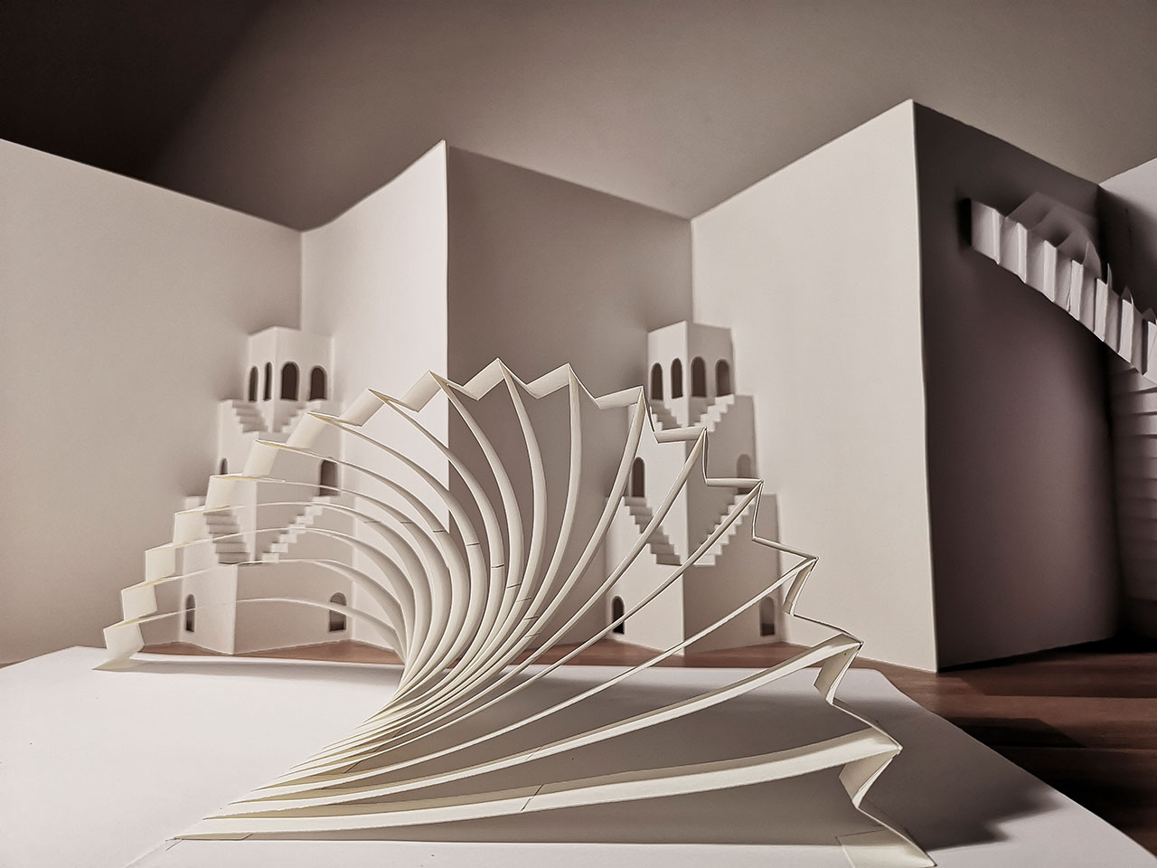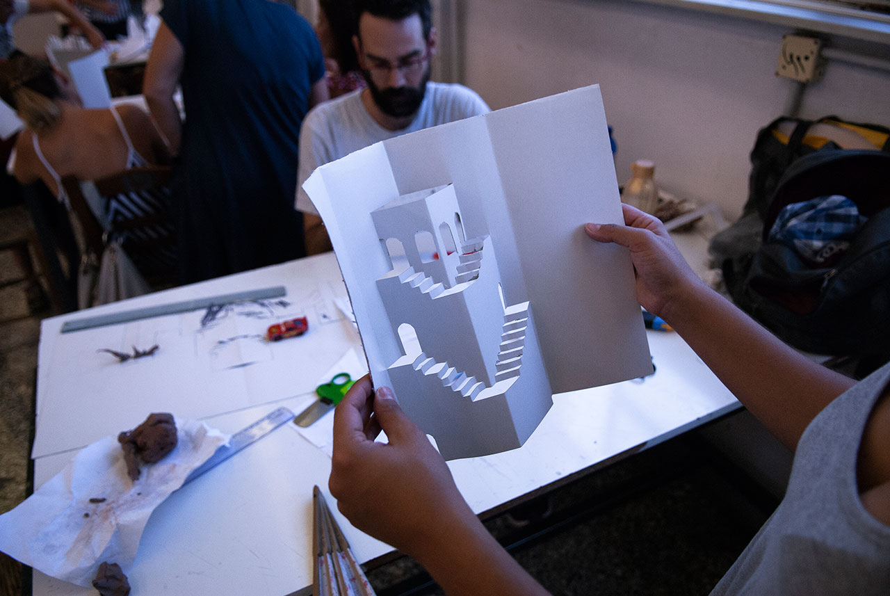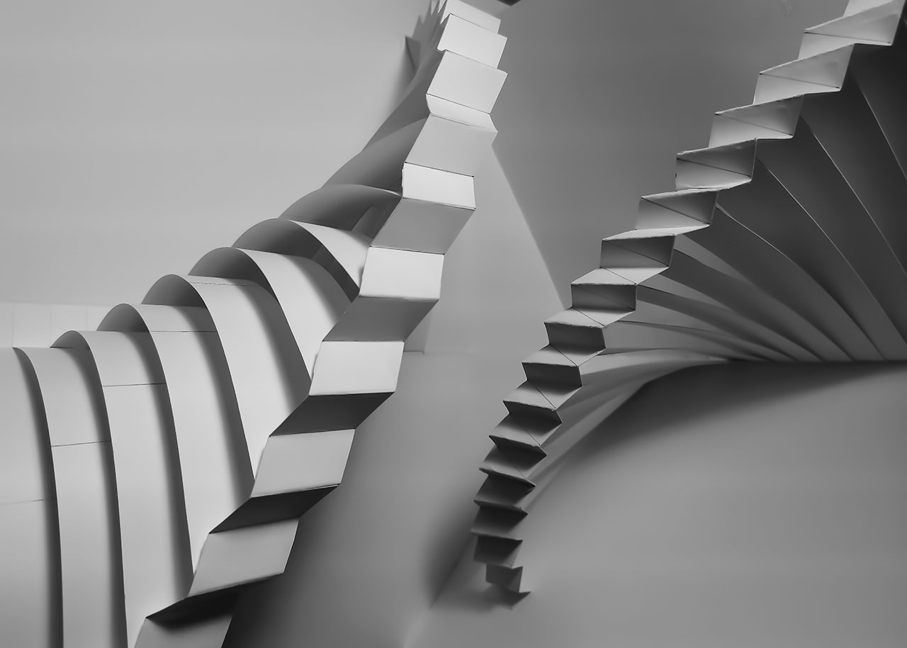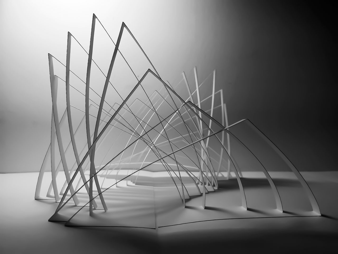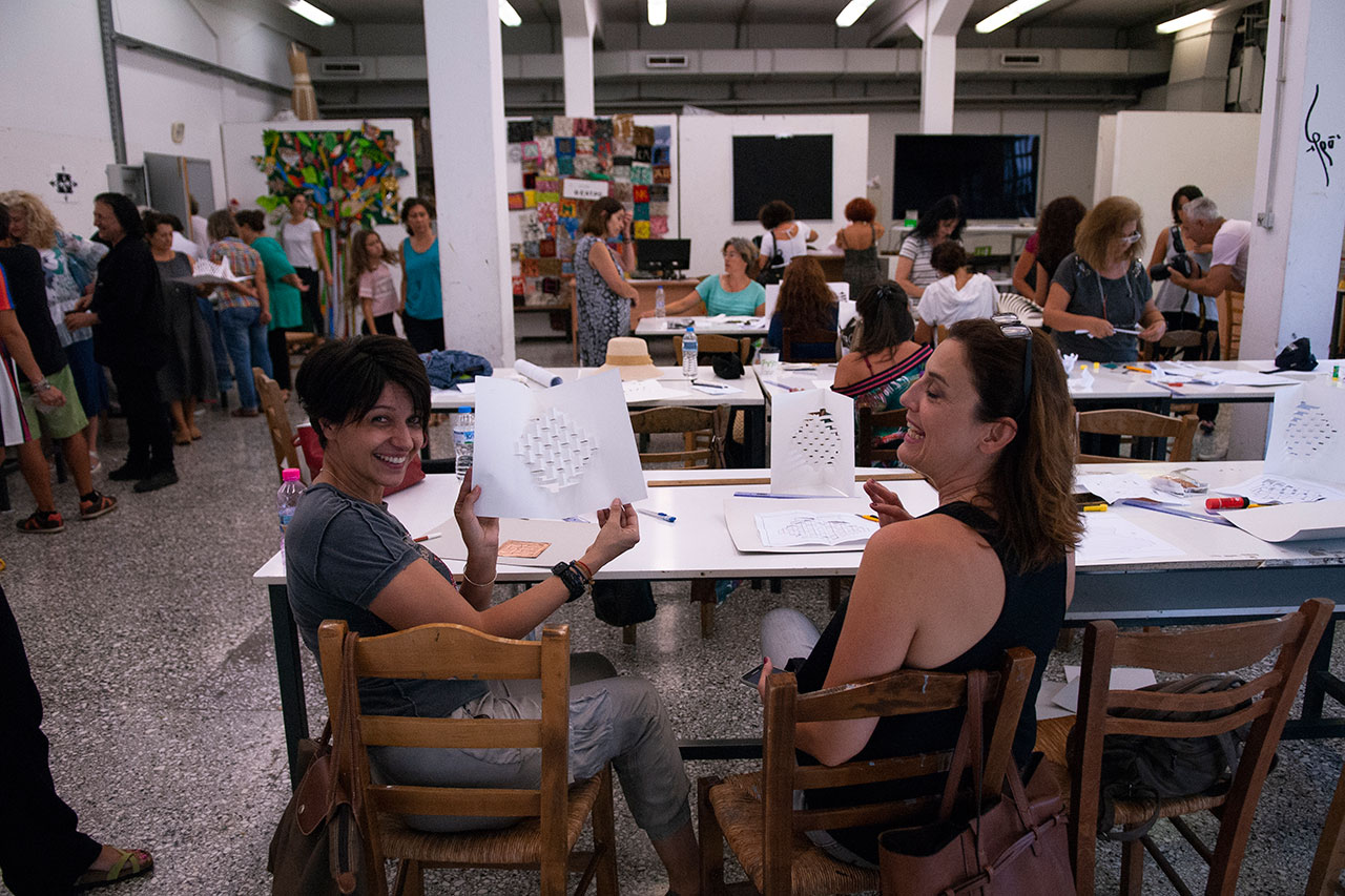 Παρουσίαση εικαστικού εργαστηρίου με δημιουργία τρισδιάστατων κατασκευών σε λευκό χαρτόνι. Αναπτύγματα γεωμετρικών σχηματισμών, με την τεχνική της χαρτοκοπτικής, διαμορφώνουν στον χώρο των τριών διαστάσεων, ευφάνταστες γεωμετρικές δομές. Με την χρήση του φωτός, αναδεικνύουμε την αρχιτεκτονική δομή της σύνθεσης, σκηνογραφώντας με την σκιά τους.