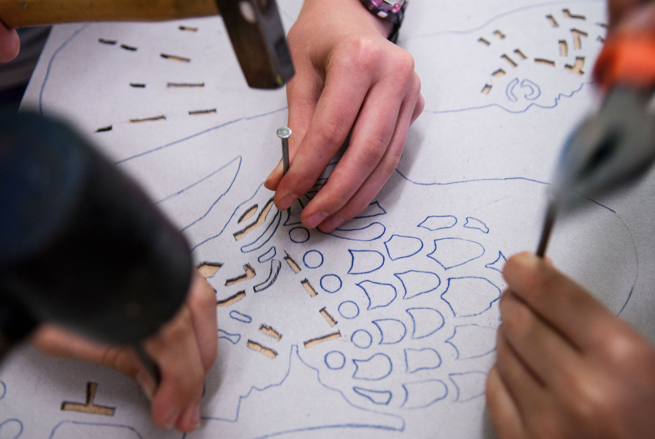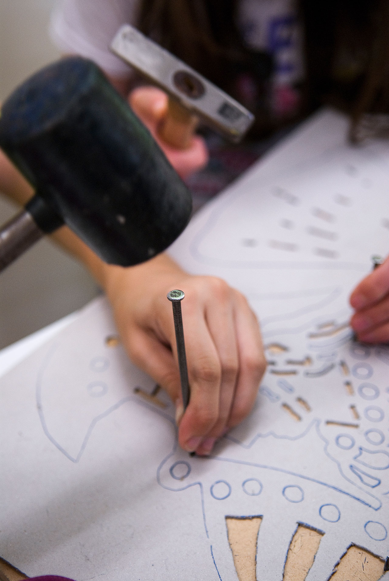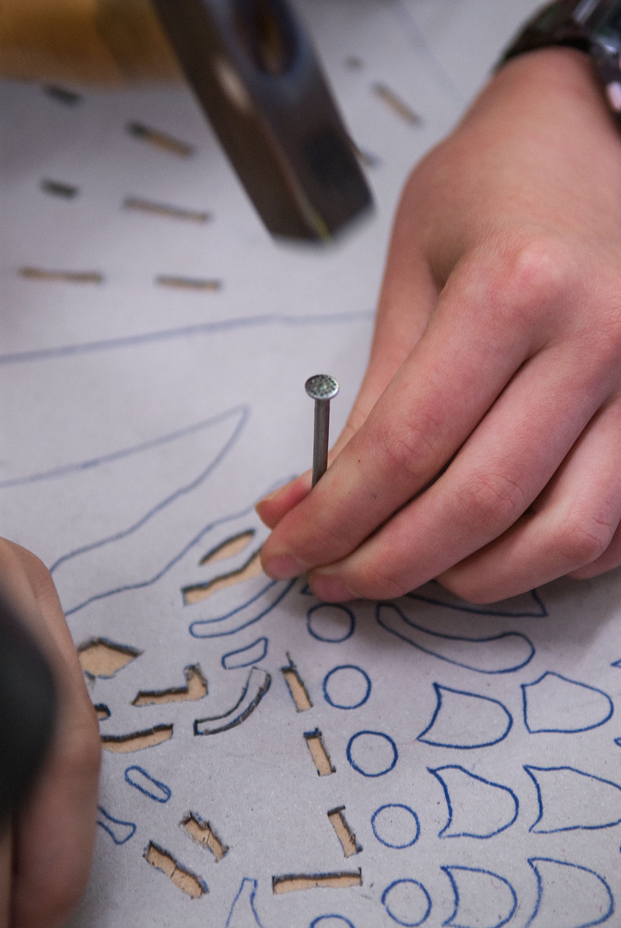 Μετά από την σχεδίαση της φιγούρας στην επιφάνεια αφαιρούμε τις περιοχές όπου θέλουμε να είναι διαπερατή στο φως, κτυπώντας με σφυρί και πρόκα με λειασμένη απόληξη. Αυτός είναι και ο παραδοσιακός τρόπος σκαλίσματος της φιγούρας του θεάτρου σκιών. Πολλές φορές στις παραδοσιακές σκαλιστές φιγούρες, οι πρόκες που χρησιμοποιούσαν, αποκτούσαν την κατάλληλη απόληξη όταν τις άφηναν στις ράγες του τρένου, ώστε να κοπούν κατά το περασμά του.