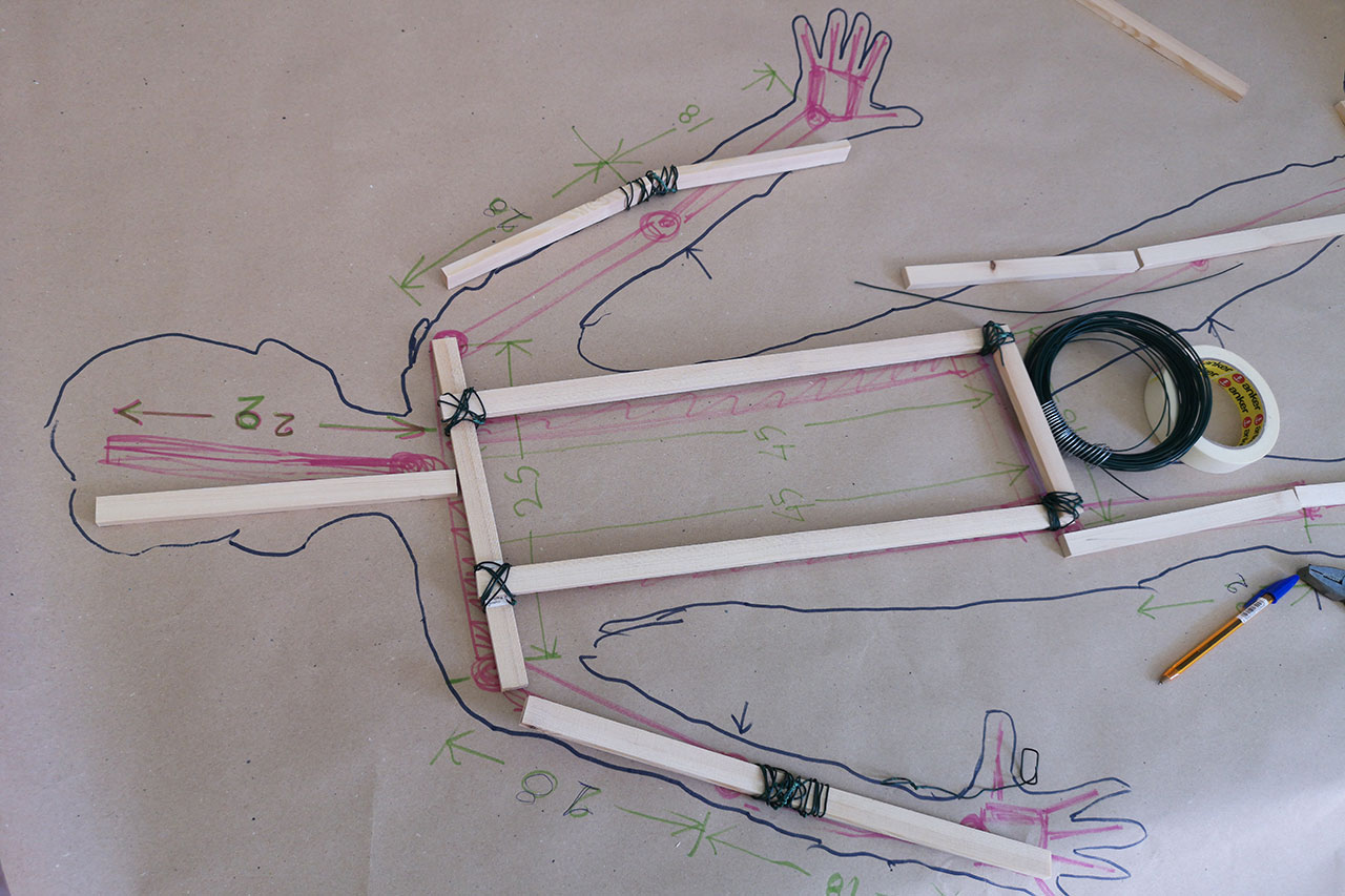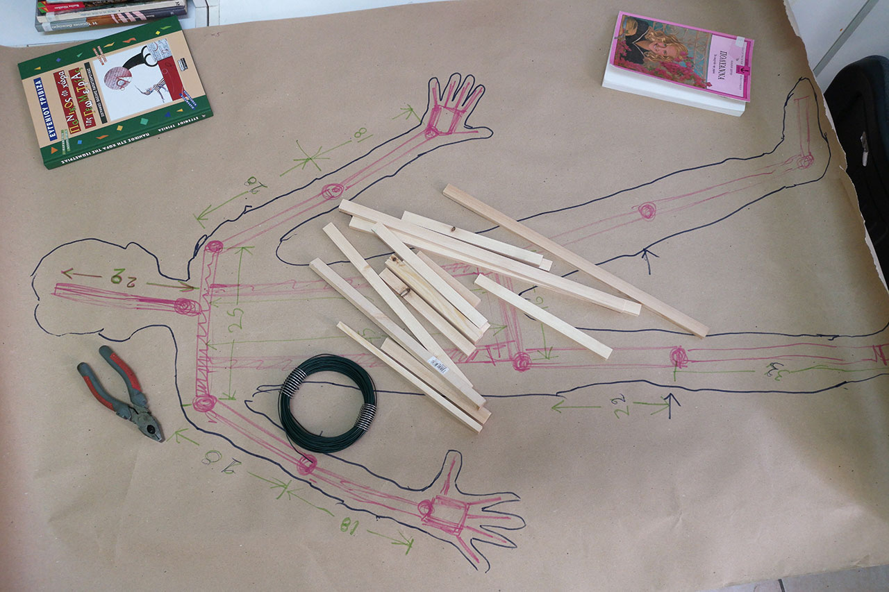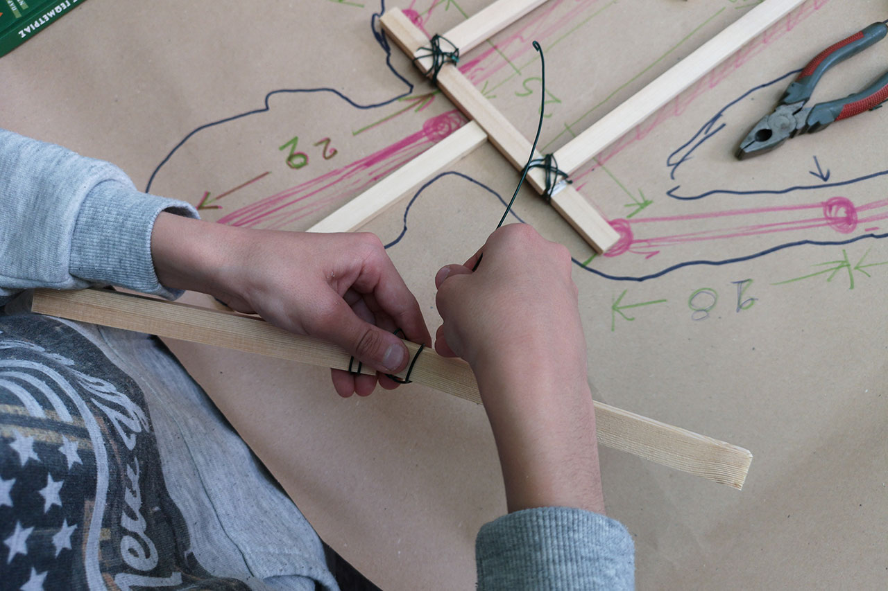 Υλικά: Ξύλινα πηχάκια, σύρμα, χαρτί του μέτρου, χαρτοταινία.