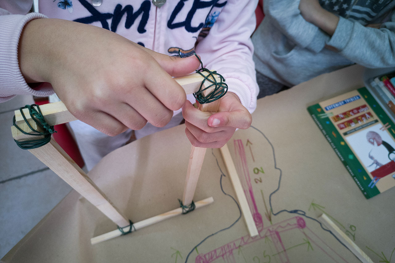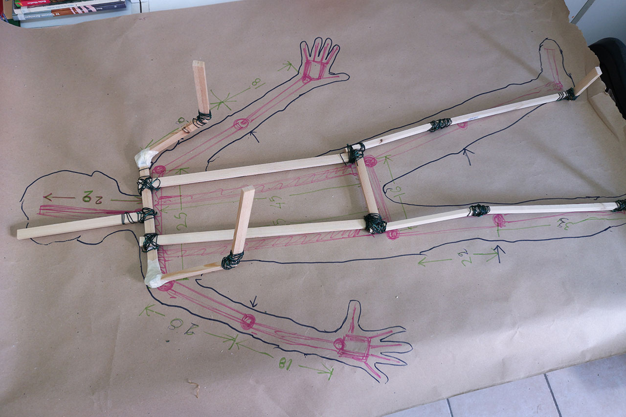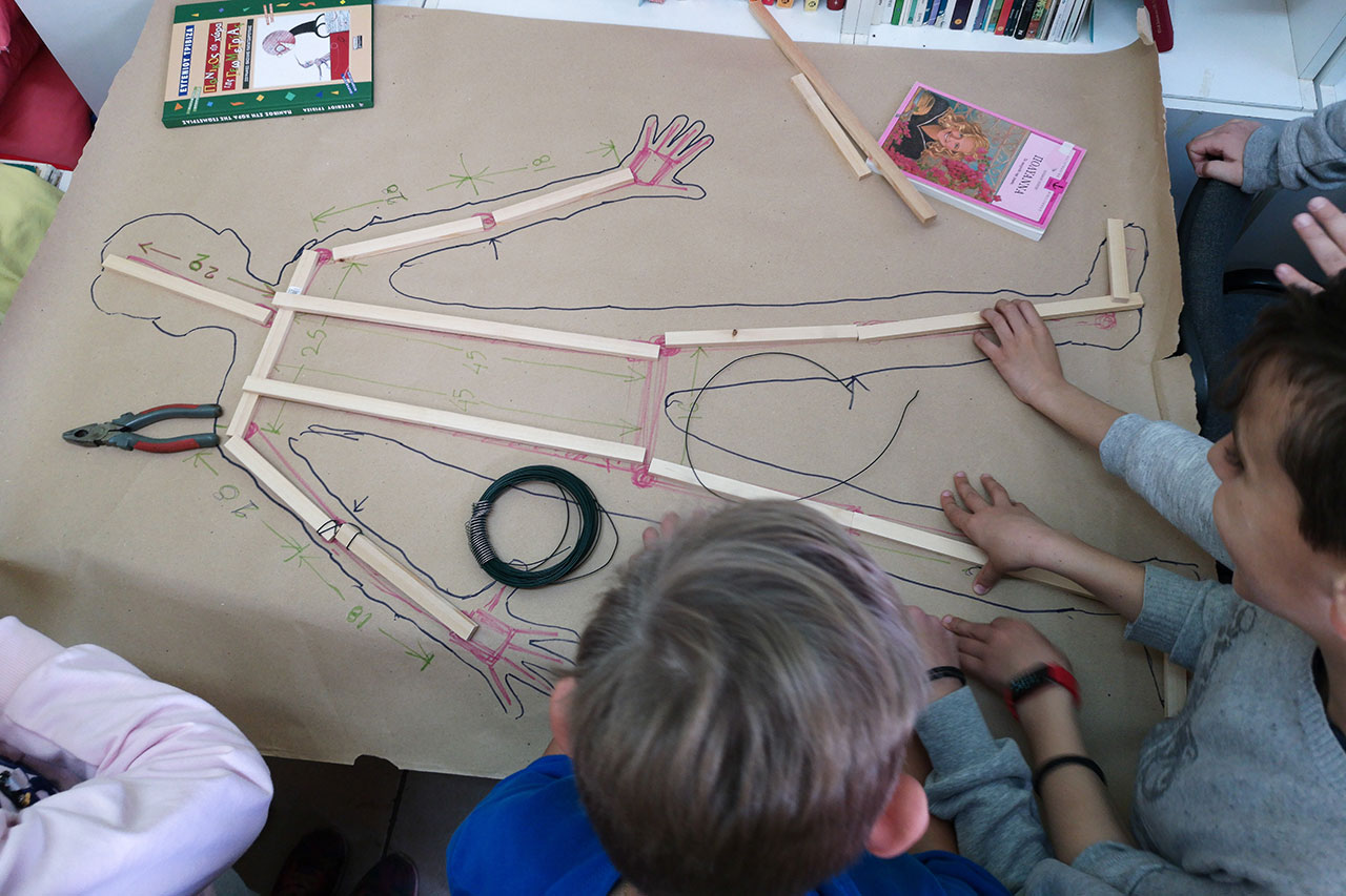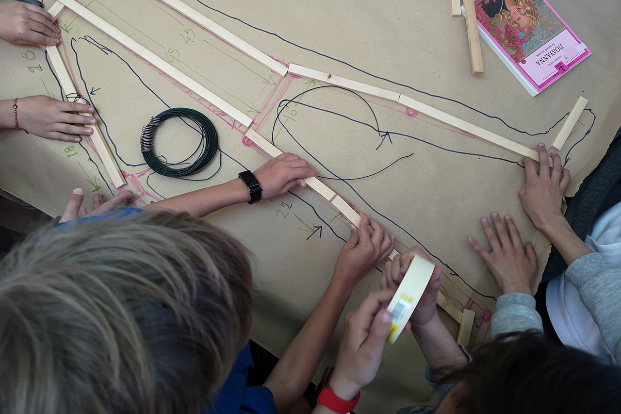 Υλικά: Ξύλινα πηχάκια, σύρμα, χαρτί του μέτρου, χαρτοταινία.