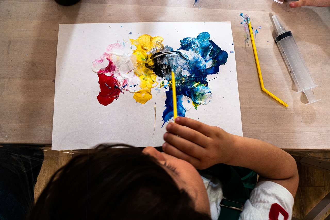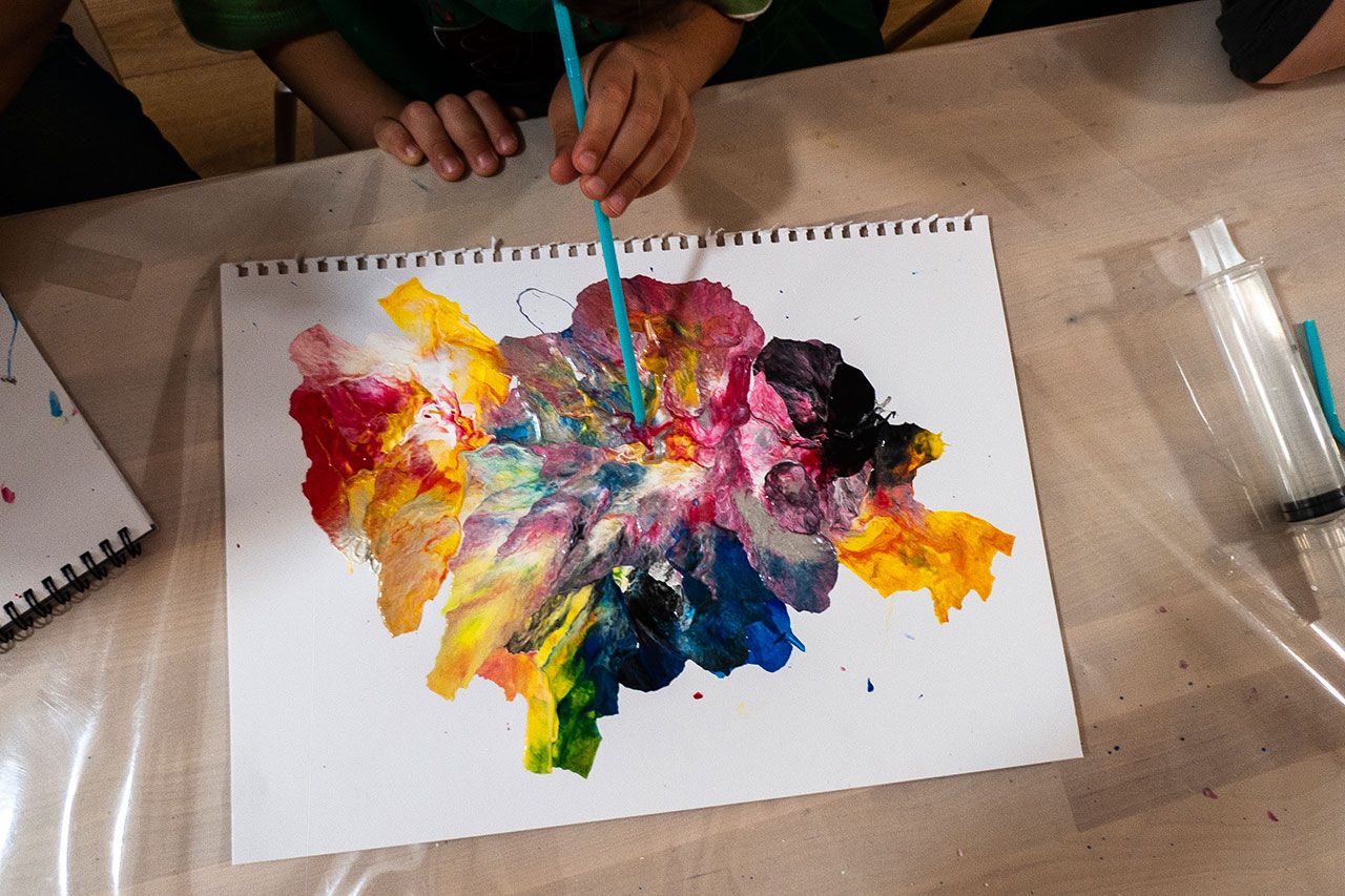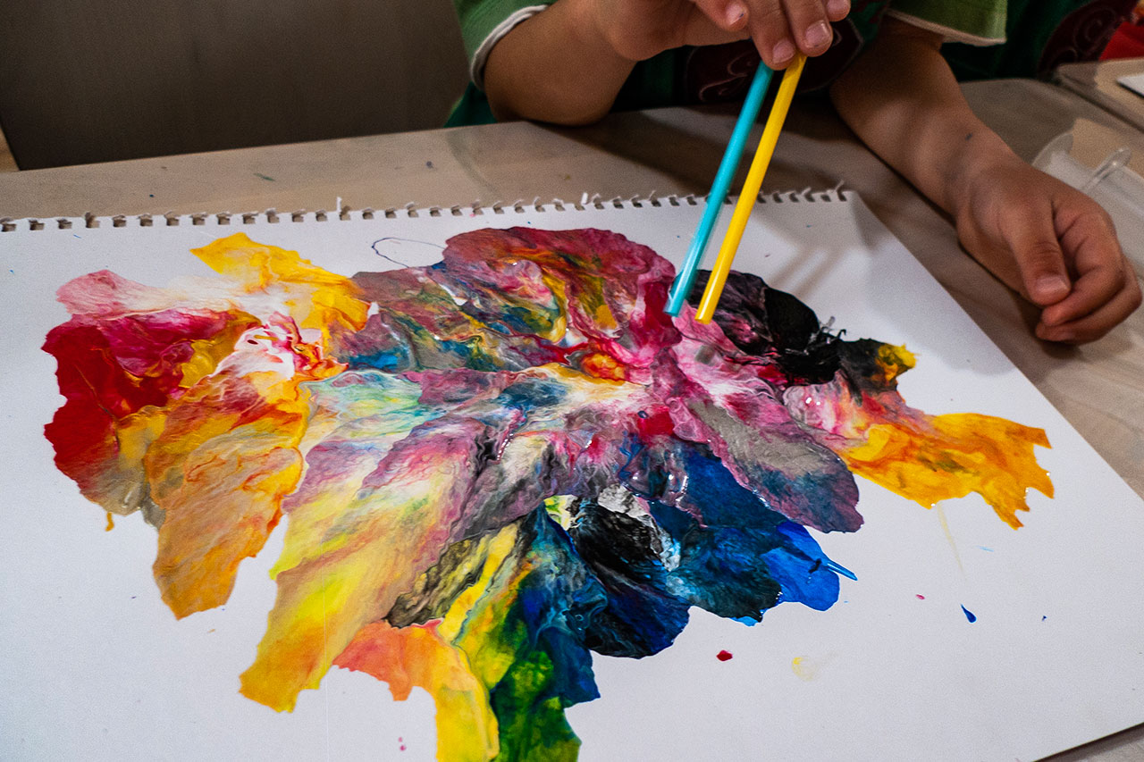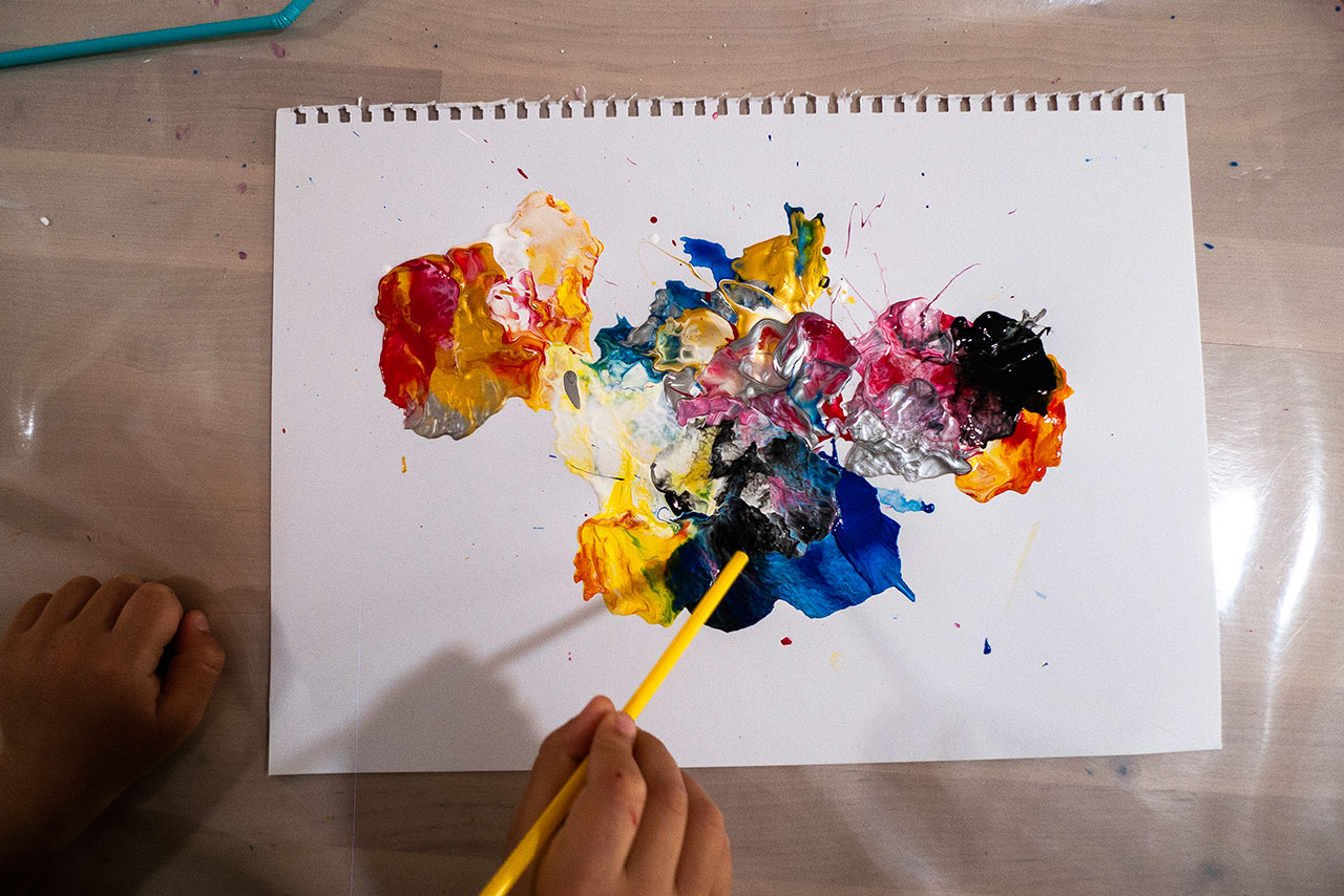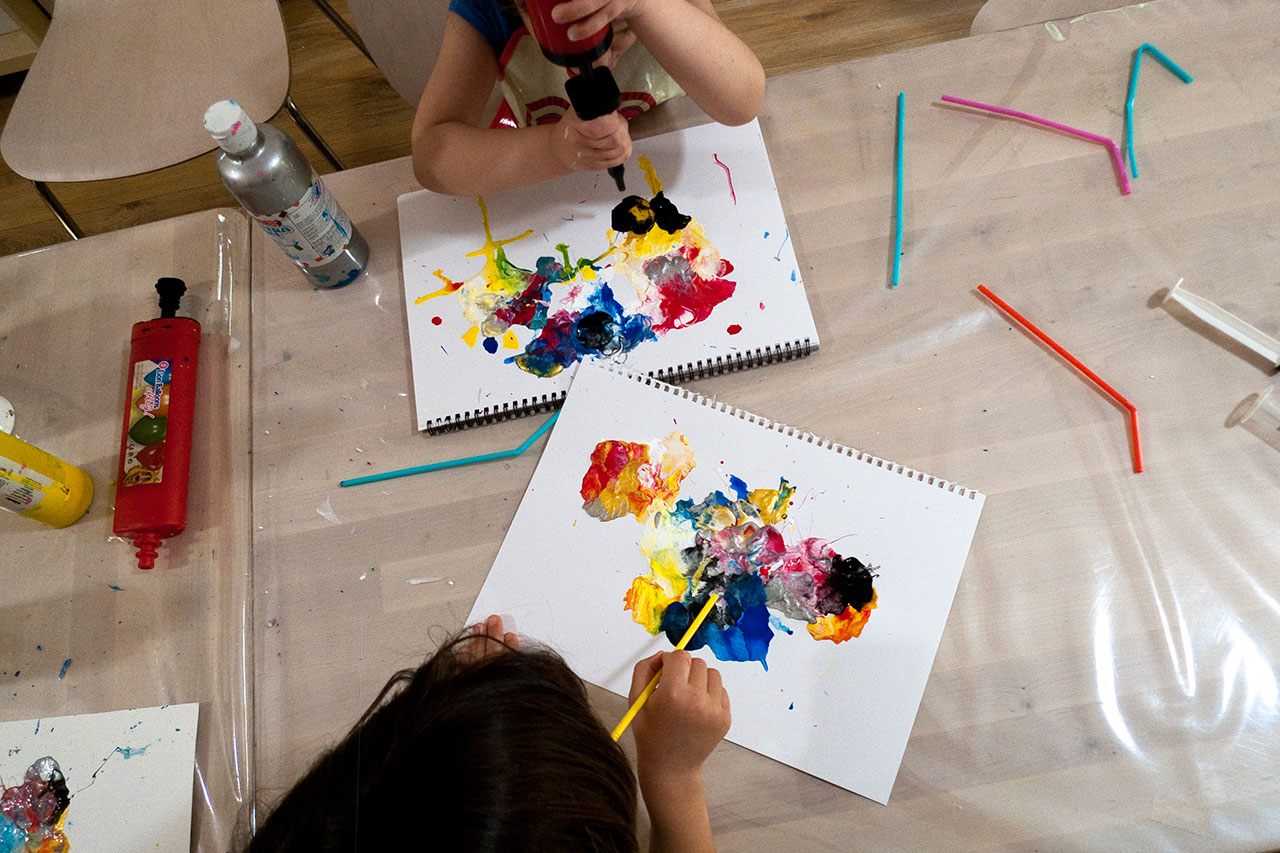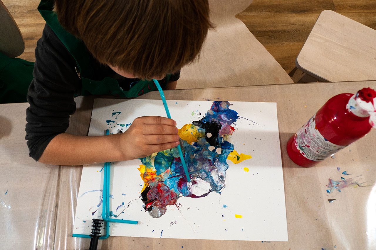 Αξιοποιώντας την δύναμη του αέρα και την δυναμική της κίνησης των χρωμάτων που αποκτούν φυσώντας με ένα απλό καλαμάκι, δημιουργούμε ευφάνταστους χρωματικούς συνδιασμούς. Τα παιδιά ανακαλύπτουν με έναν πρωτότυπο τρόπο τις ιδιότητες των χρωμάτων και φτιάχνουν τα δικά τους έργα ‘’Αφηρημένης Τέχνης’’.