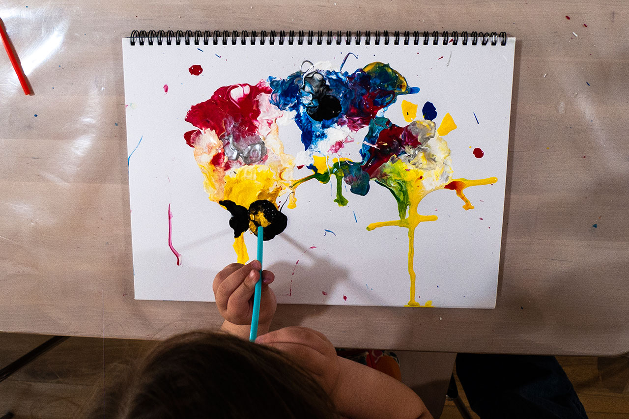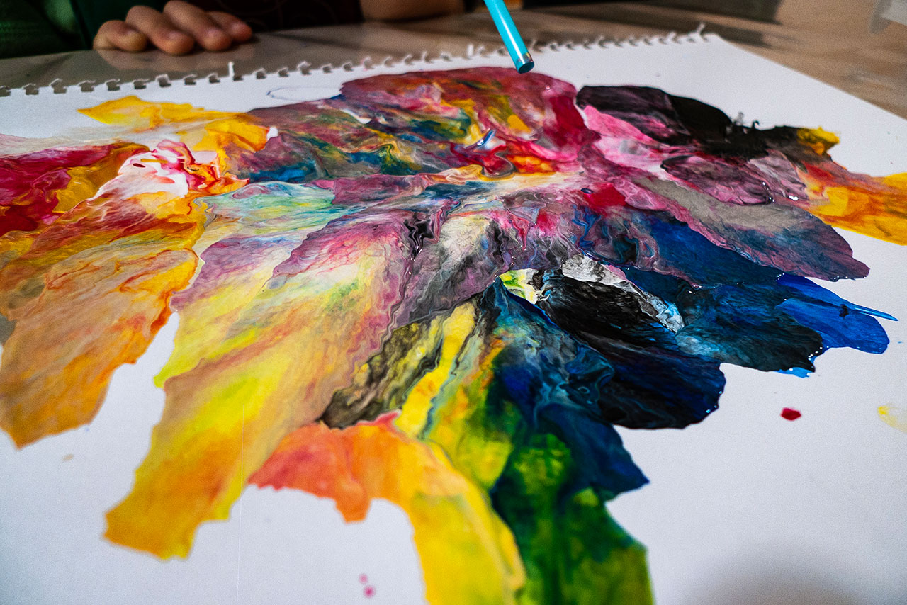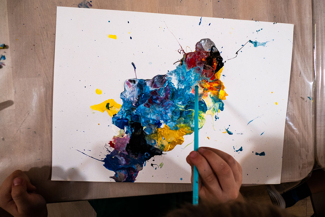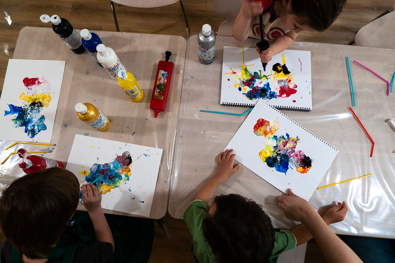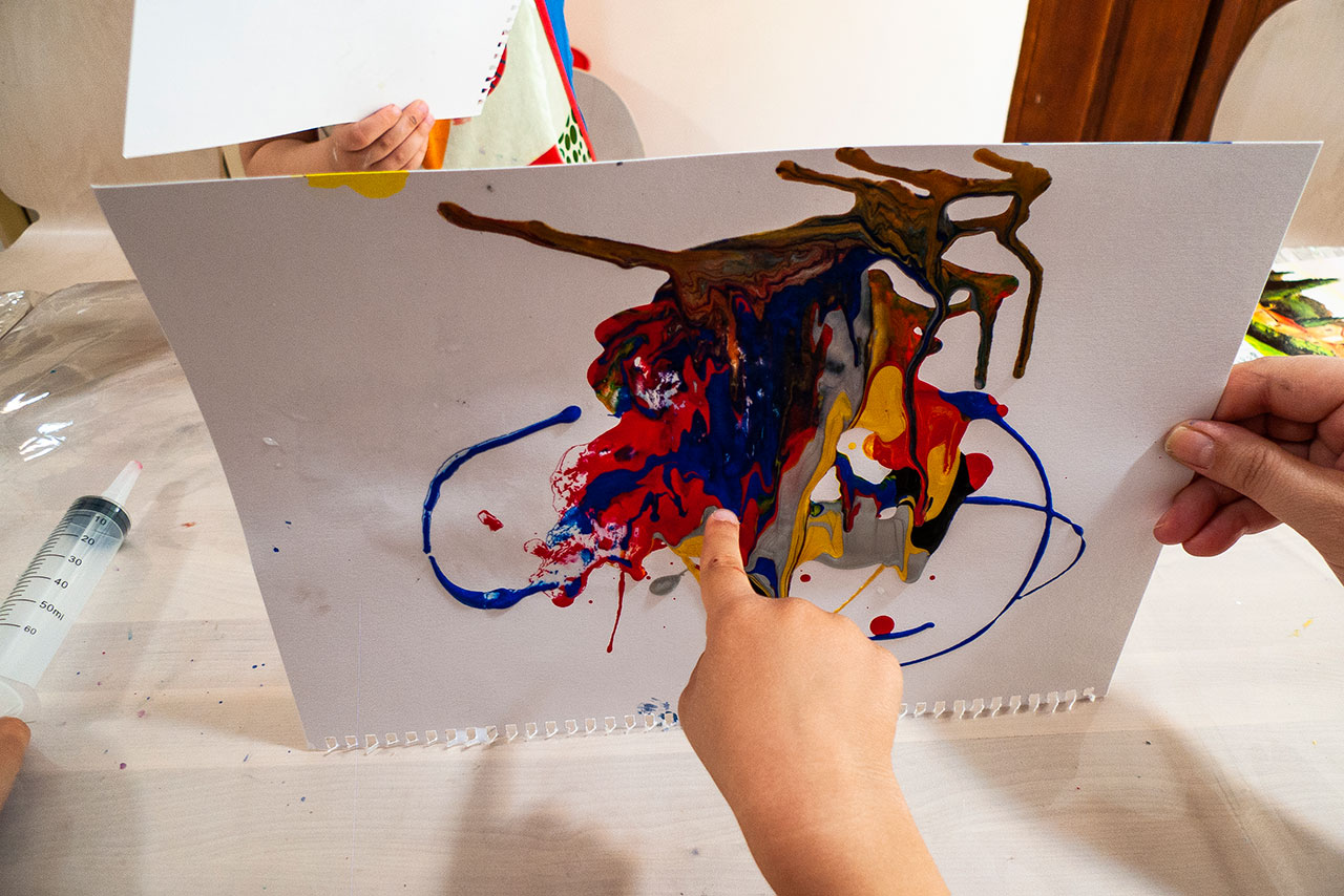 Αξιοποιώντας την δύναμη του αέρα και την δυναμική της κίνησης των χρωμάτων που αποκτούν φυσώντας με ένα απλό καλαμάκι, δημιουργούμε ευφάνταστους χρωματικούς συνδιασμούς. Τα παιδιά ανακαλύπτουν με έναν πρωτότυπο τρόπο τις ιδιότητες των χρωμάτων και φτιάχνουν τα δικά τους έργα ‘’Αφηρημένης Τέχνης’’.